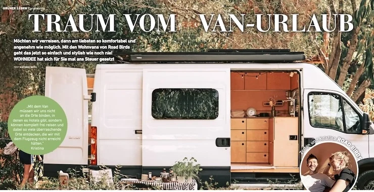 „Der Traum vom Urlaub mit dem Wohnvan wird immer populärer. Kein Wunder, denn mittlerweile kann man so stylisch, komfortabel und angenehm wie noch nie auf vier Rädern verreisen. Das wissen auch Kristina und Zoltan von ROAD BIRDS“. Das schrieb das Interior Design Magazine über Road Birds nach unserem Interview.